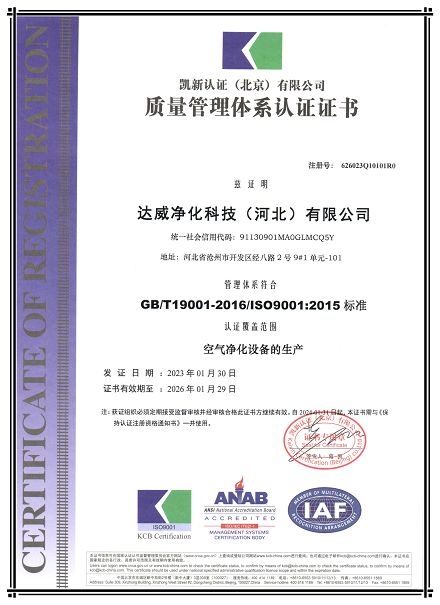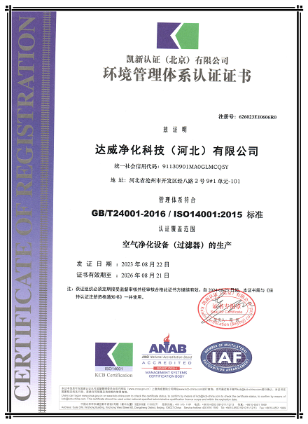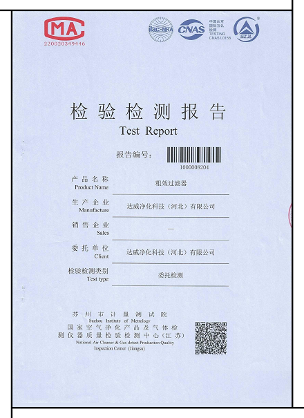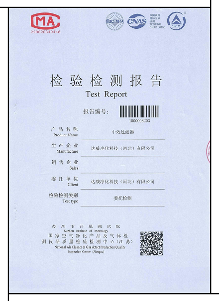 The company has obtained certifications for ISO 9001 Quality Management System, ISO 14001 Environmental Management System, and ISO 45001 Occupational Health and Safety Management System. The air filter series products have passed the quality inspection and testing certification of national professional institutions. The company has advanced testing equipment such as a performance testing platform for middle and high efficiency air filters, a scanning testing platform for high-efficiency filters, and a performance testing platform for filter media. It has also established an "Air Filtration Equipment Technology Research and Development Center". The company has a 100000 level standardized clean production workshop of 600 square meters, with an annual production capacity of over 500000 sets of air filters.